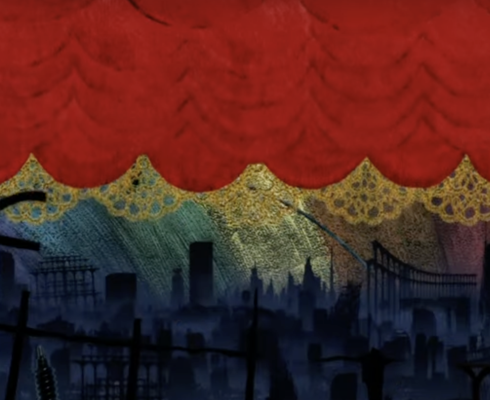 Even in the night maze in the second scene, the lack of light and shadow highlights abstraction. The spectator is confused and given a stronger sense of unreality by the mosaic effect.