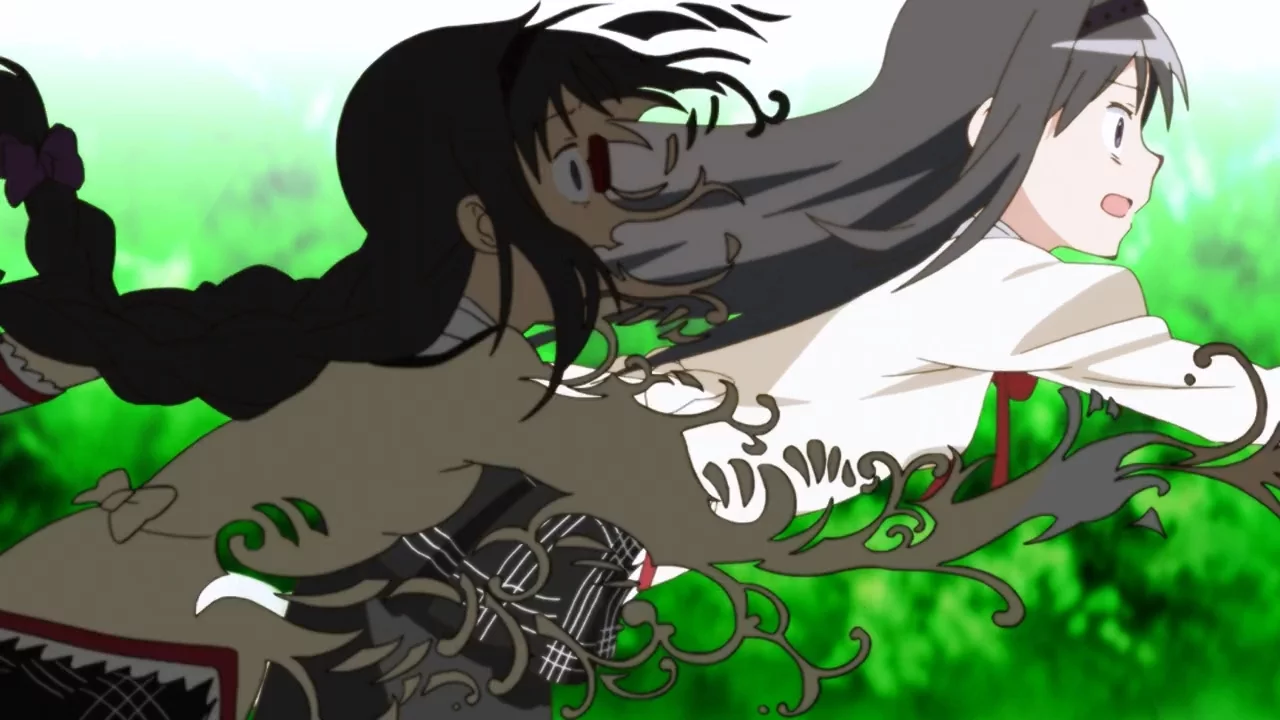 At first, Homura and Madoka sit in a vivid environment with lots of vegetation, but this is all in Homura's head. When Madoka falls, strange things happen that alter Homura's look. In an attempt to save Madoka, Homura becomes unrecognizable, mirroring her own life's trajectory. When Madoka hits the ground, her pink paint is symbolically splattered, and when Homura is destroyed, her purple paint is splattered. Homura's emotional fluctuations show an internal struggle.